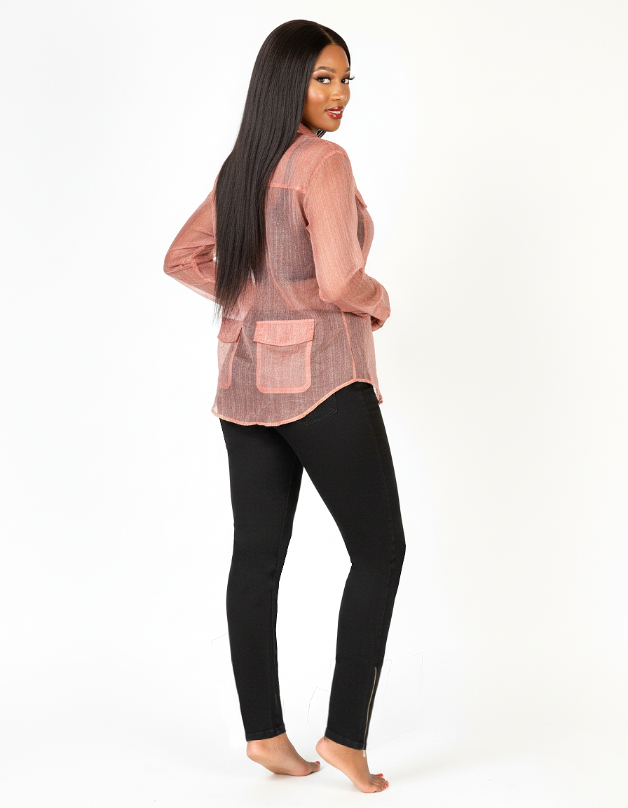 This organza blouse is a statement piece that exudes confidence and charm. Crafted with lightweight, semi-transparent fabric, it features a collared neckline and chest pockets for a touch of sophistication. The front tie detail allows for a customizable fit, making it versatile for both casual and dressy occasions. Pair it with sleek trousers or a fitted skirt to complete the look.
